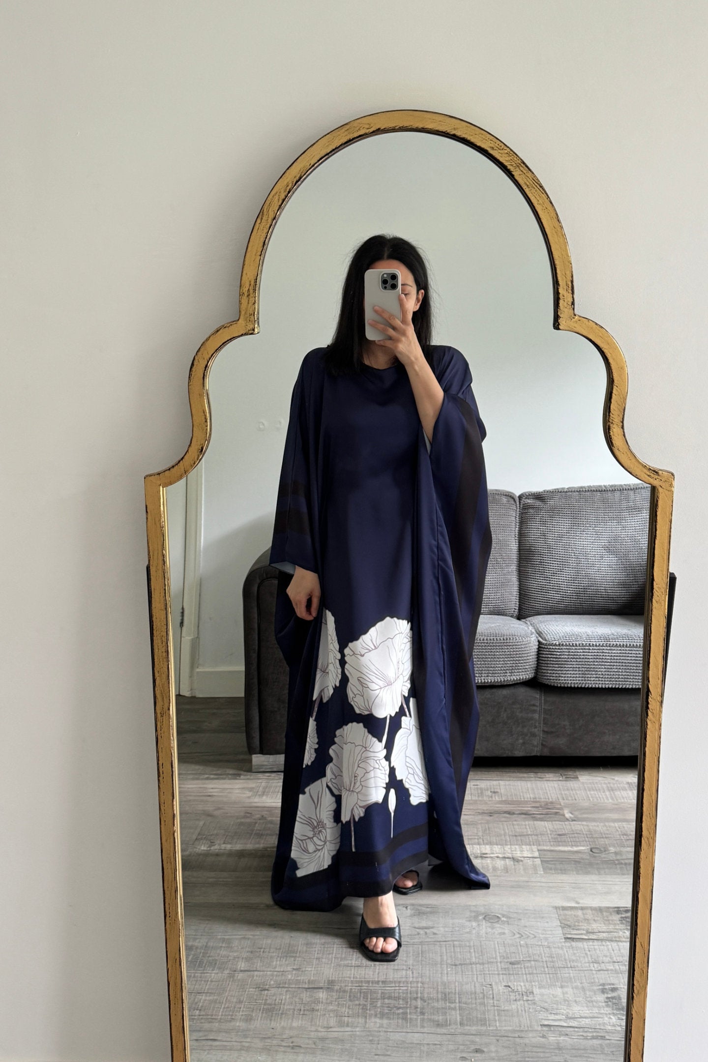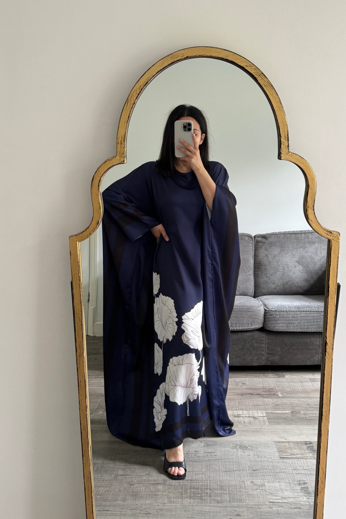 Make a bold yet graceful statement in our Printed satin Kaftan - Navy Blue. Crafted from silky satin with a fluid drape, this kaftan features a stunning floral and stripe print in soft tones contrasted with bold black accents. The relaxed silhouette is elevated by a hidden inner belt that allows you to cinch the waist for added shape or leave it flowy and free. It's an effortlessly chic choice for Eid, gatherings, or Luxe lounging.